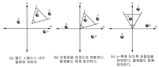 이때 월드에 대한 관점이 바뀌지 않도록 하기 위해서는 카메라에 맞추어 월드 내의 모든 기하물체를 변환해야 하는데, 이와 같은 변환을 뷰스페이스 변환이라 하며, 이변환을 거친 뒤의 기하물체는 뷰스페이스 내에 위치한다.